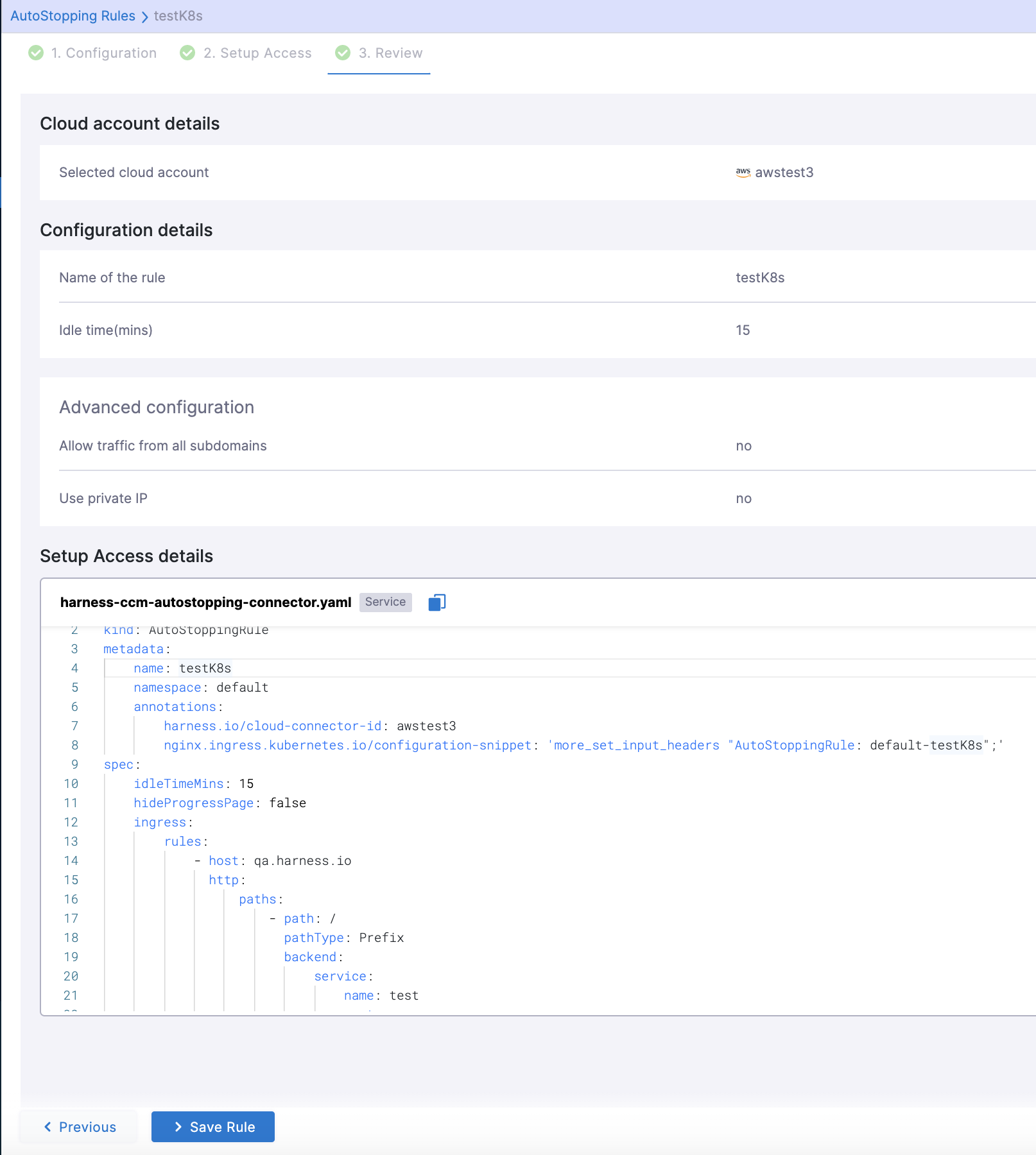 For the detailed steps, see the Create a Kubernetes Connector for AutoStopping Rules.