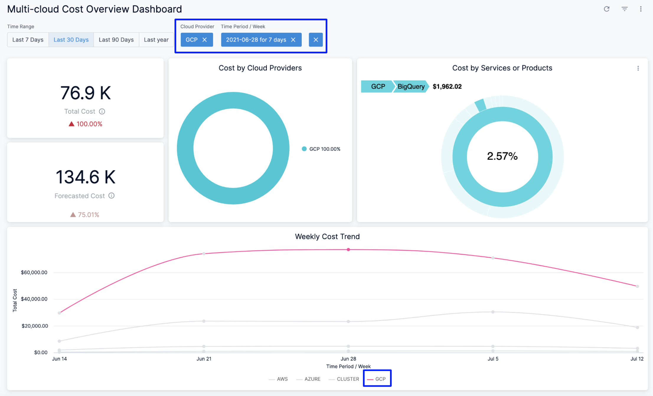 4. In Cost by Cloud Providers, click the cloud provider to view the cost of a specific cloud provider. For example, click GCP to update the dashboard data only for GCP.