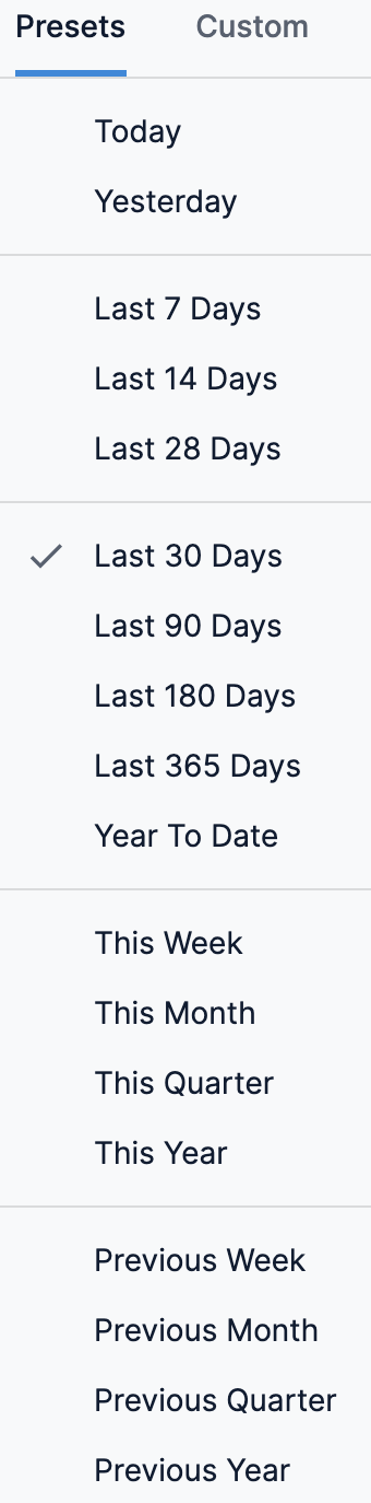 Presets: Select a Preset filter. For example, Today, Yesterday, etc.