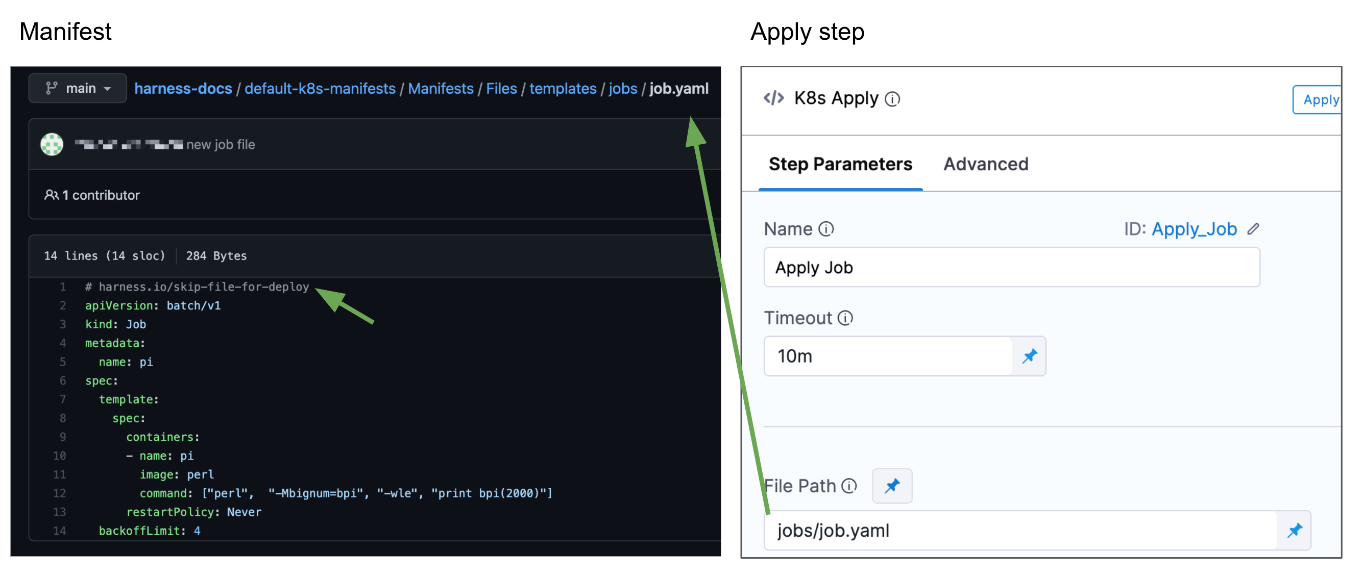 The following image shows how you can ignore a Jobs manifest and then apply it separately using the Apply step.