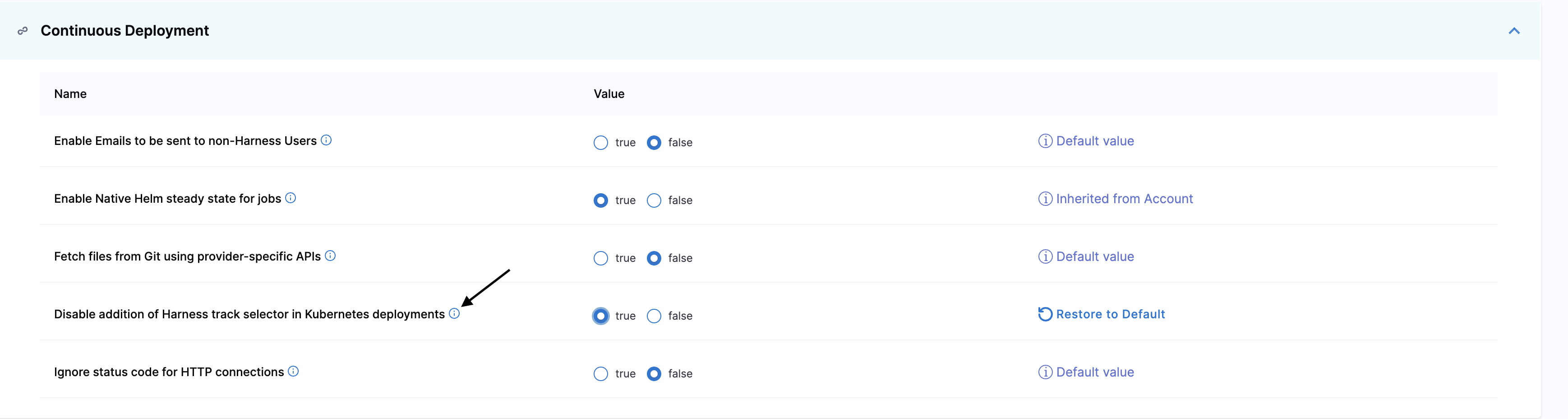 3. Under Continuous Deployment, you can set Disable addition of Harness track selector in Kubernetes deployments as true.