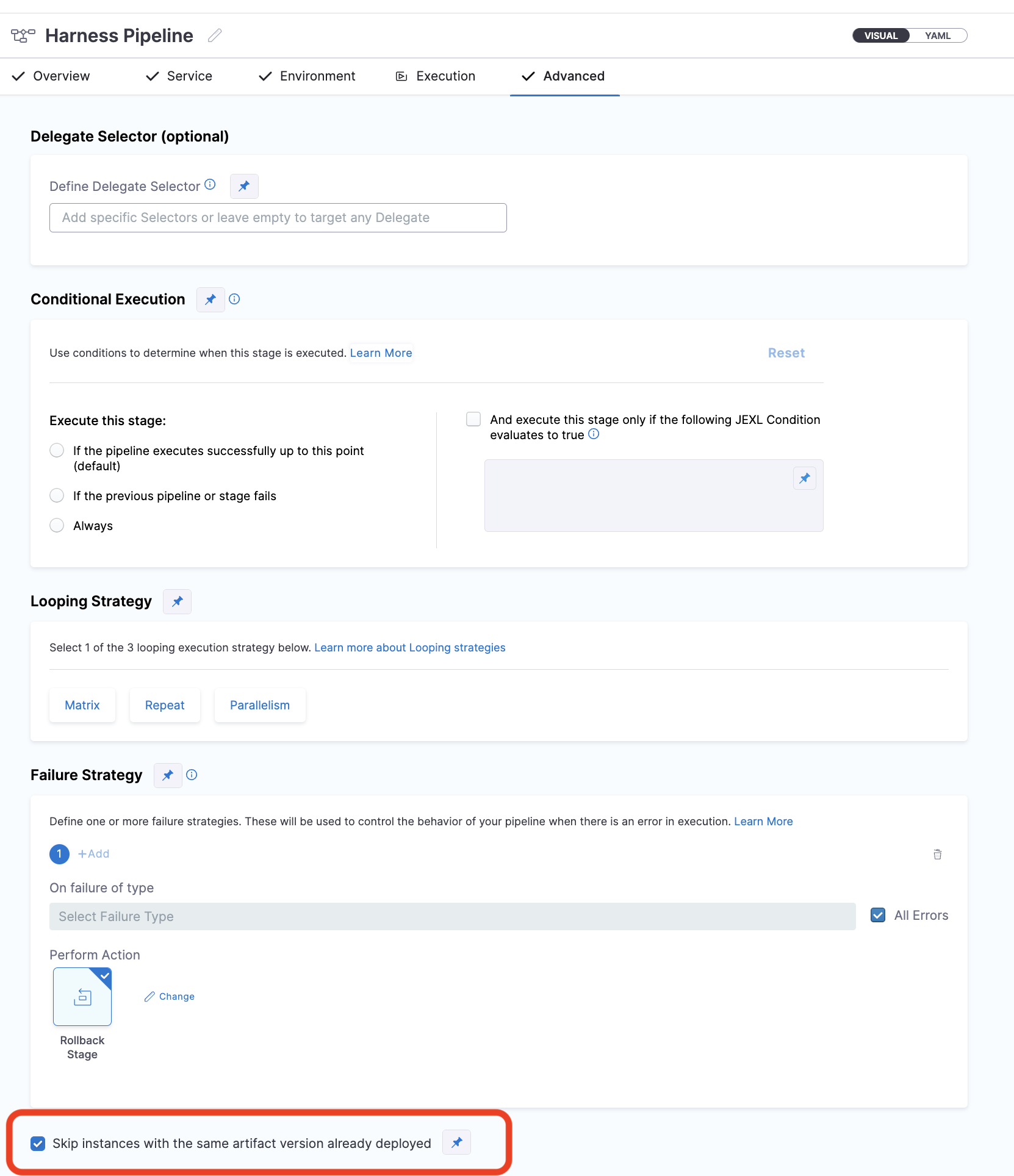 • In case of multiple stages referencing the same service, environment, and infrastructure details, Harness will rollback the deployment to last successful pipeline with stage execution that shared the same service, environment, and infrastructure.