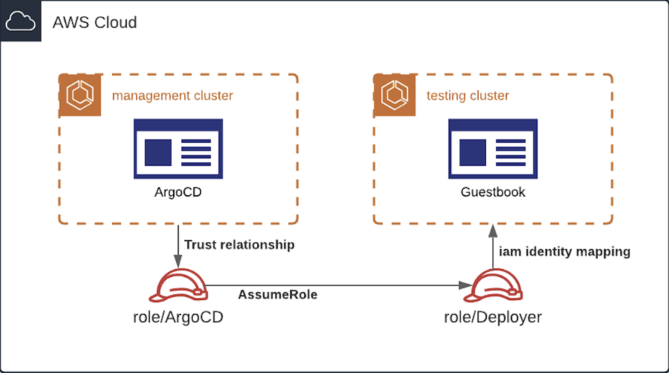 infoIn a multi account setup, you can change the trust relationship to reference the ArgoCD role in the account that holds the management cluster, and place the Deployer role in the same account as the testing cluster.