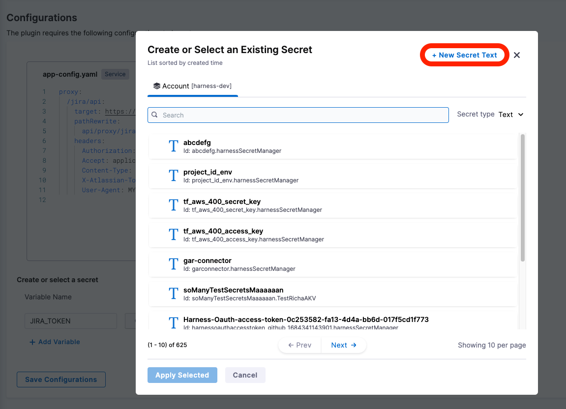- Create secret in Harness to store API token: Once token is generated, click on the “input field” next to