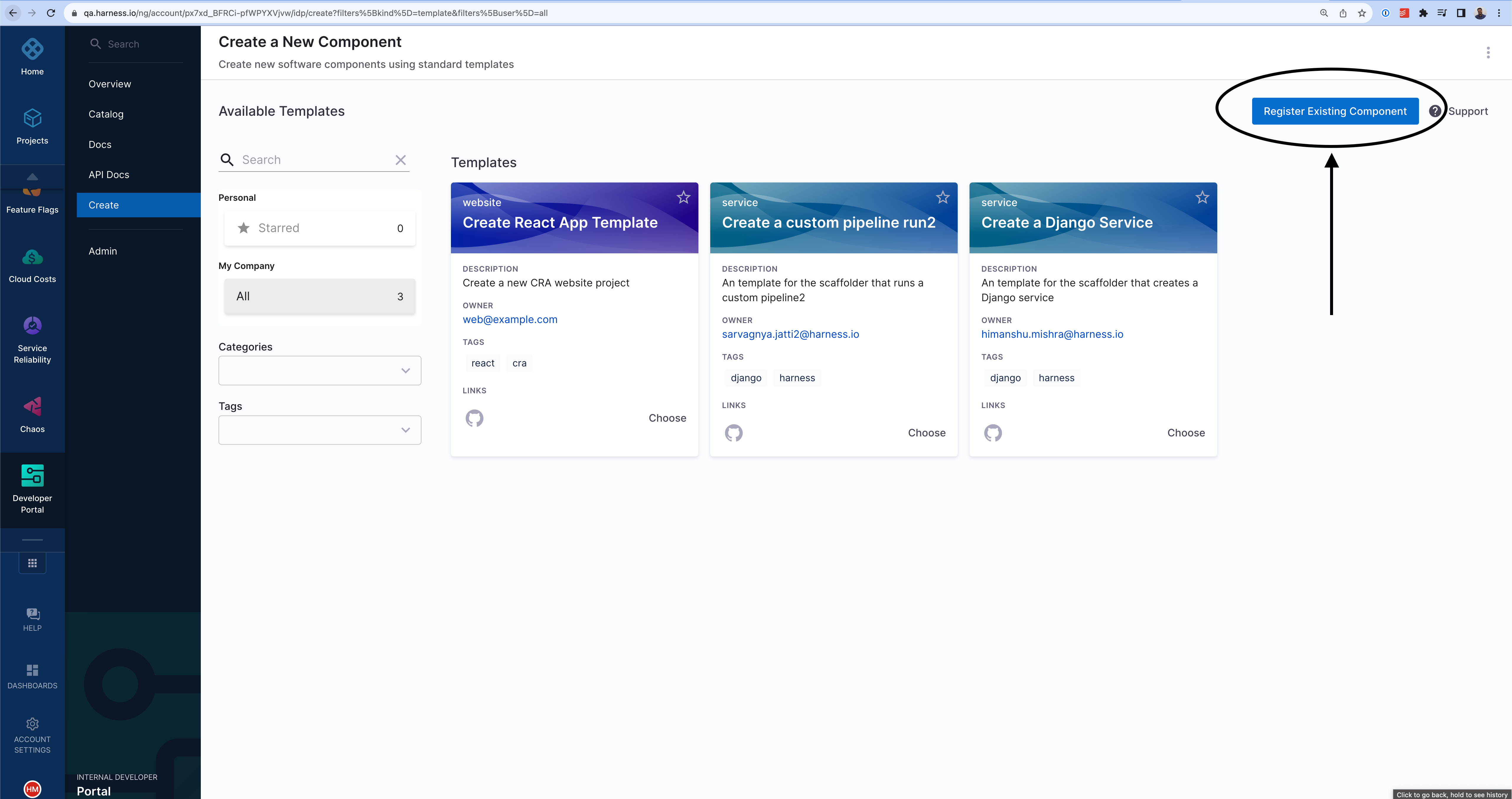 Follow the steps below to register components in the Harness Platform UI: