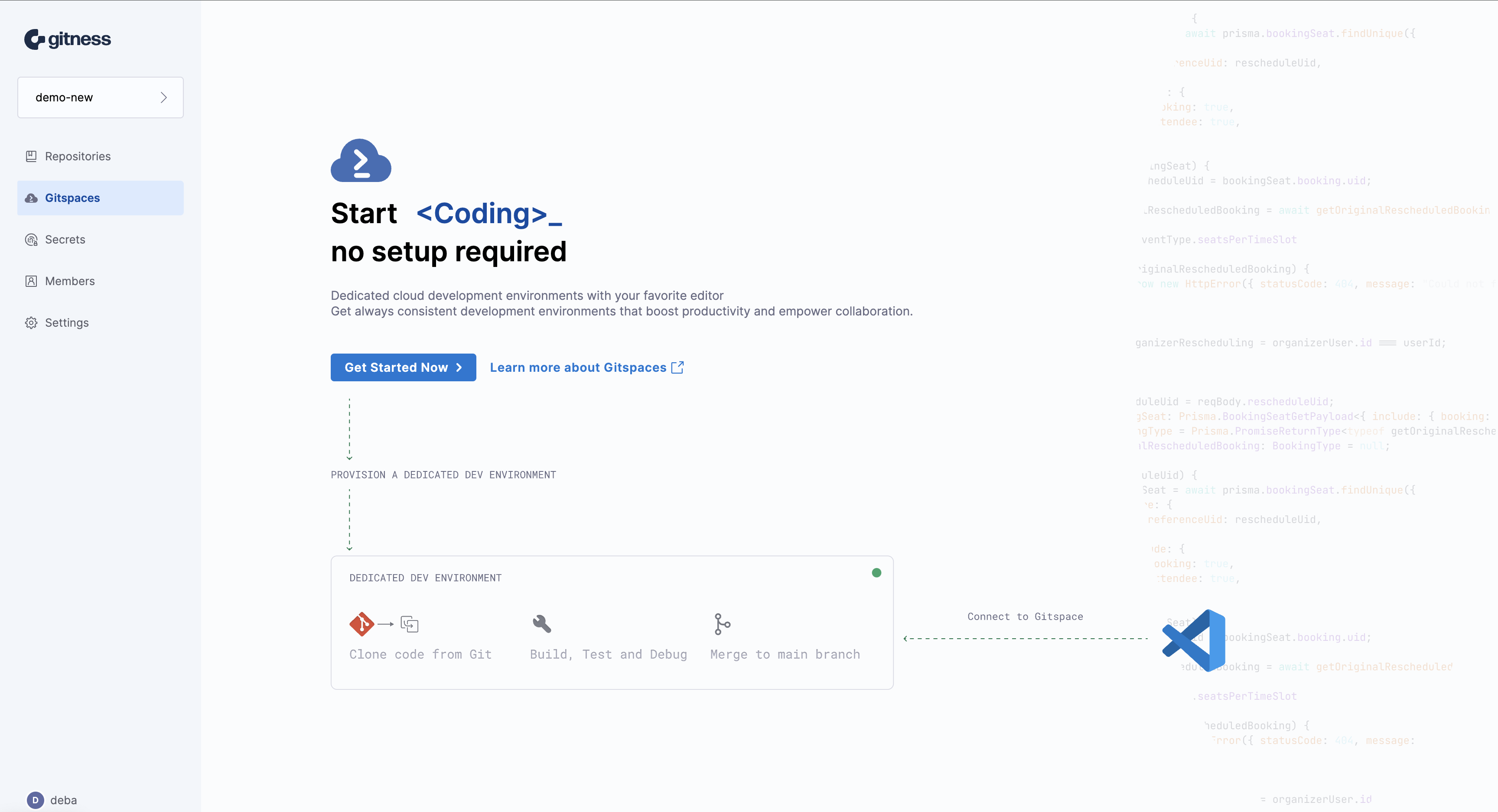 This Quickstart guide aims to provide users with an introduction to developing using Gitspaces. We will demonstrate all the features of Gitspaces using a Node.js app, helping developers write code, test changes, and publish those changes to their remote repository.