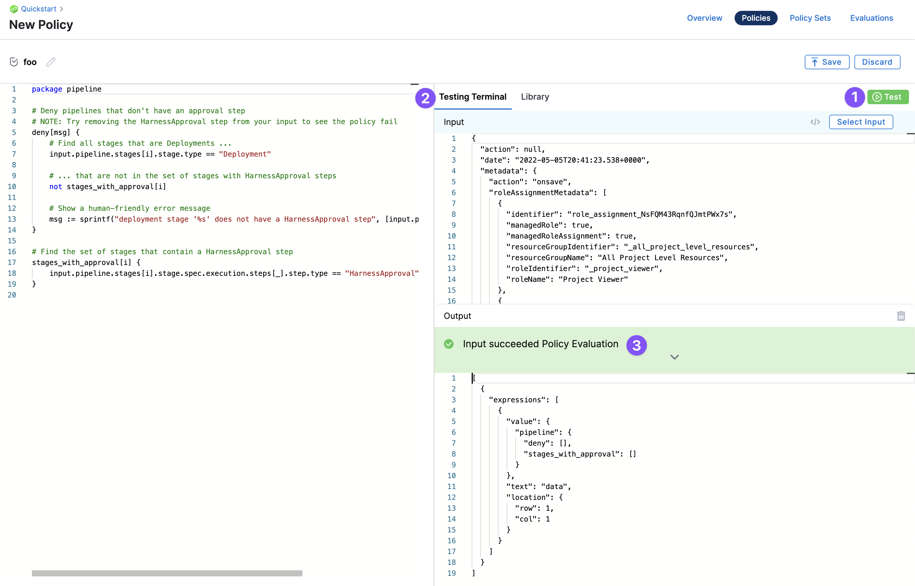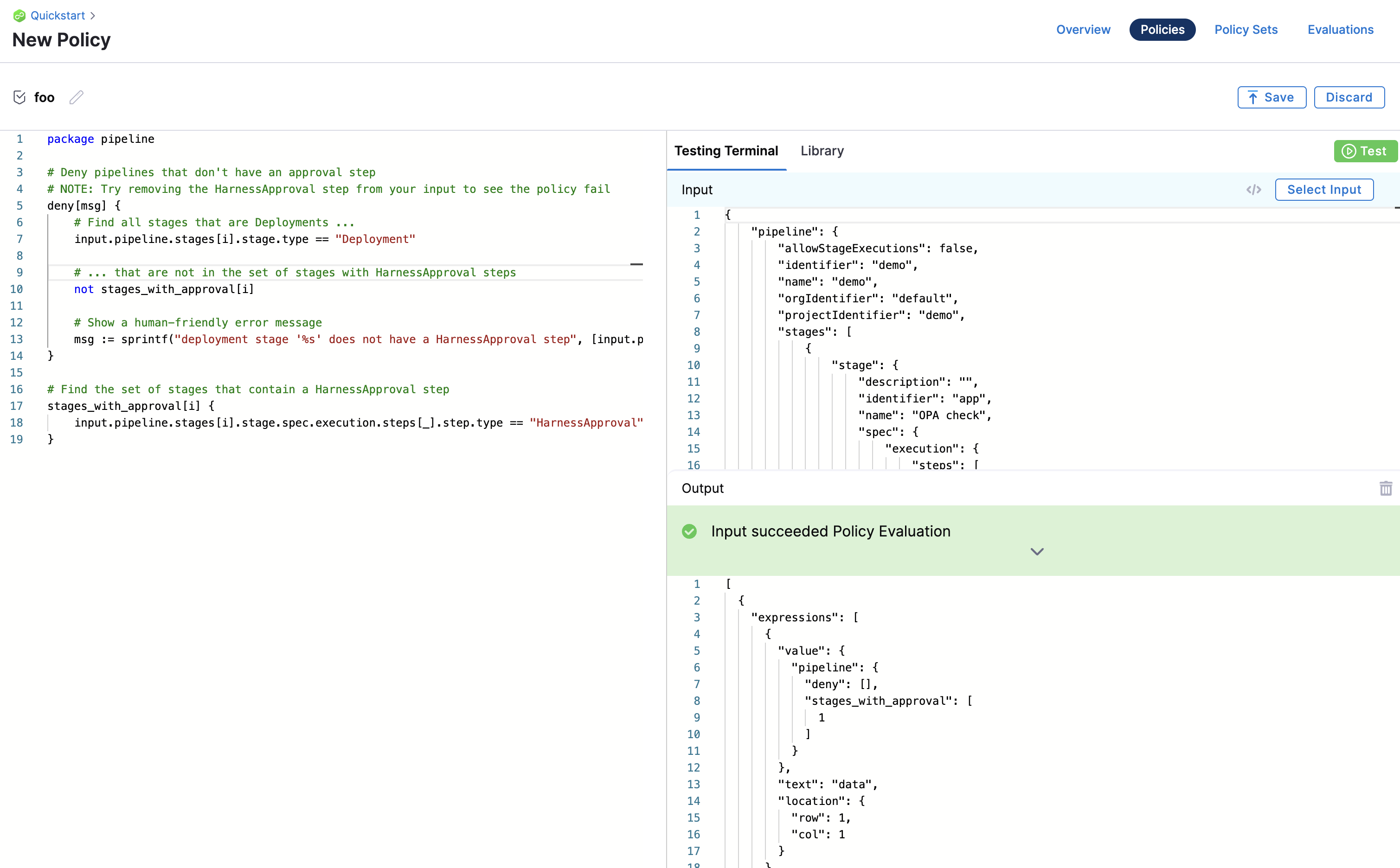 For an example of how to use the policy editor, see Harness Policy As Code Quickstart.