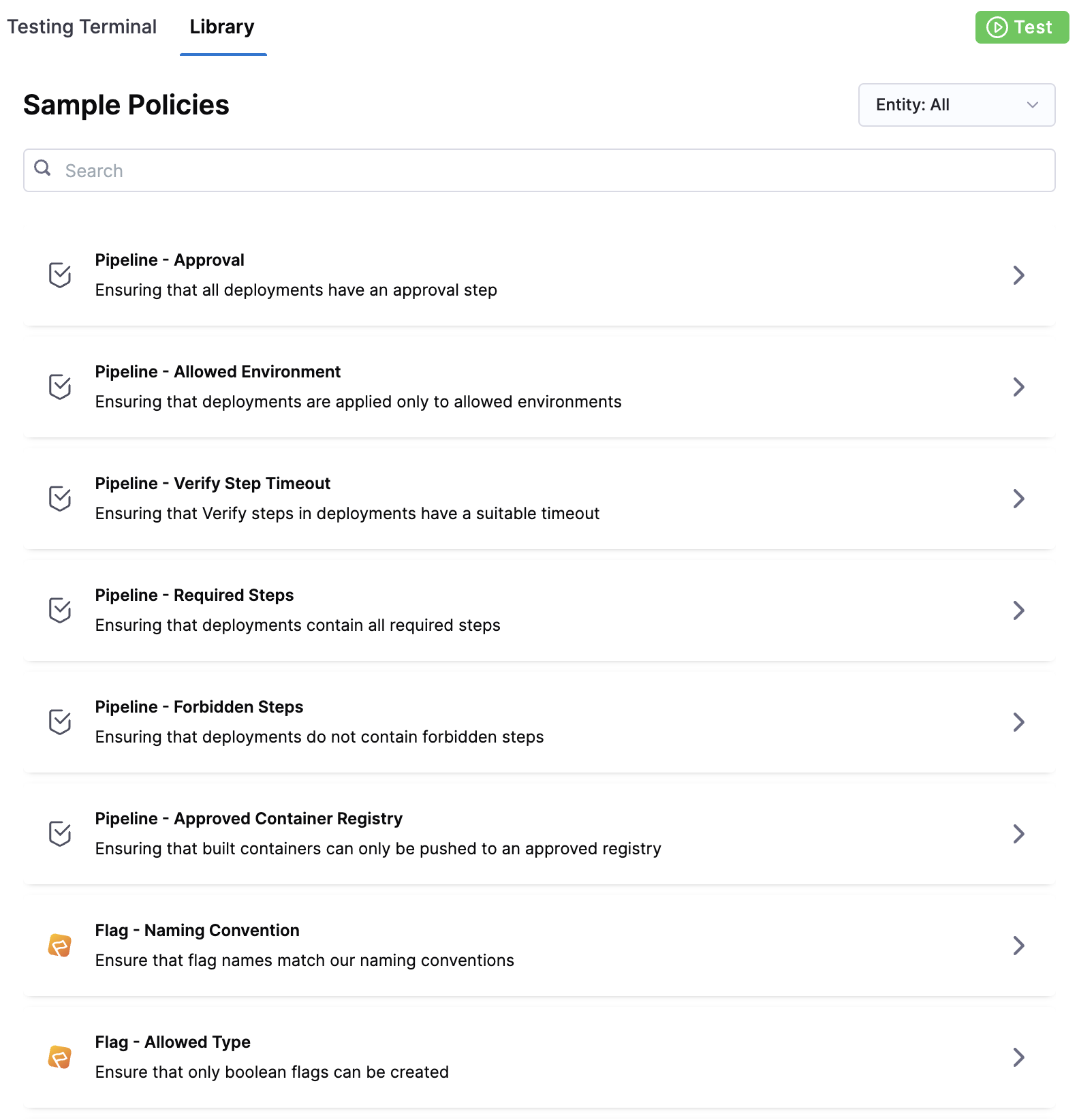The Custom entity type provides flexibility to enforce policy evaluations against any input payload during Pipeline execution. This is done using the Policy step. See Add a Governance Policy Step to a Pipeline.