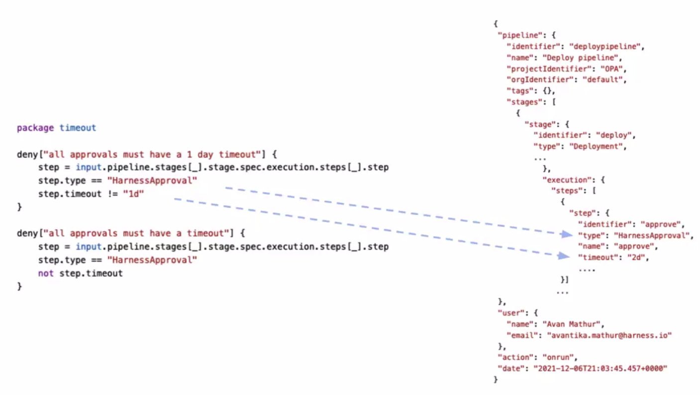 Policies are written against an input payload, which is the JSON representation of the entity that the policy is being enforced against (Pipeline, Feature Flag, etc). It's important to note that input JEXL expressions/variables are not resolved before the JSON is sent to OPA.