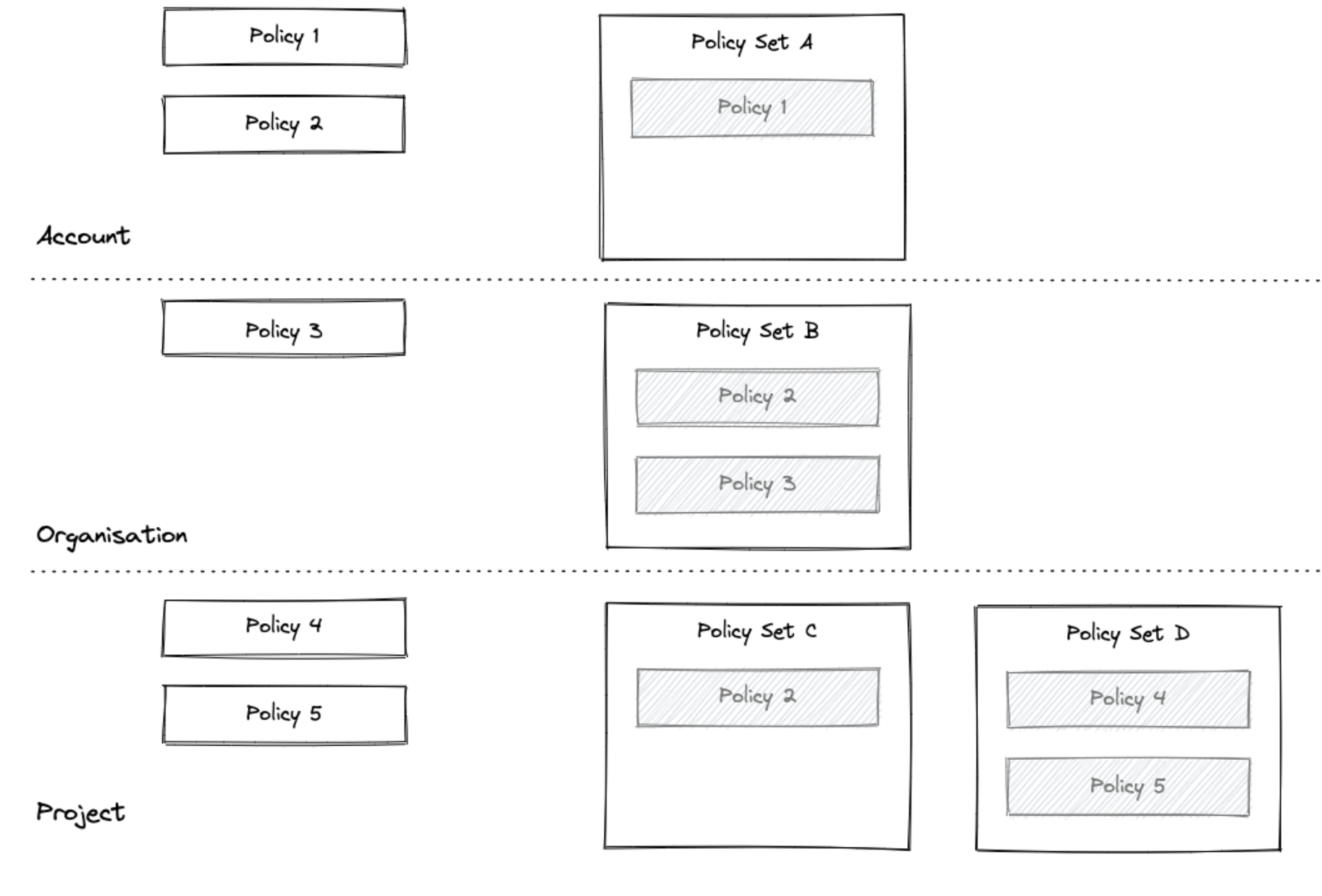 - Policies saved at the Account level can be added to Policy Sets in the Account, or Orgs and Projects within that Account.