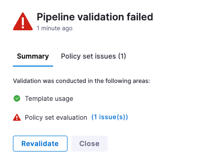 - Clicking on the flag will outline the policies that are in violation, and the direct issues can be further investigated. Once changes are made, there is also the ability to re-validate the pipeline