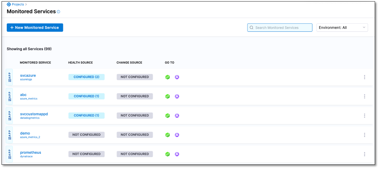 1. In Harness, select Deployment > Monitored Services. A list of monitored services is displayed. The list also displays the number of health sources configured for each monitored service.