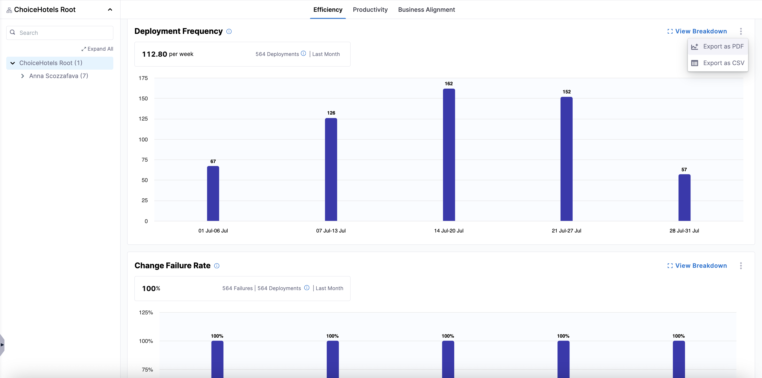 Export data for entire insight categories, such as Efficiency, Productivity, and Business Alignment. This includes all widget metrics like Lead Time for Changes, Deployment Frequency, Change Failure Rate, and Mean Time to Restore.