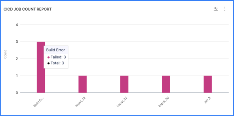 This provides information on the total number of jobs executed. The job count information is represented as a bar chart visualizing the number of CI/CD jobs run in a given time frame. The widgets supports drill-down for in-depth analysis.