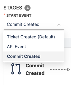 When the Commit Created event is chosen as the starting point, the Workflow begins with the Commit Created stage. This is followed by: