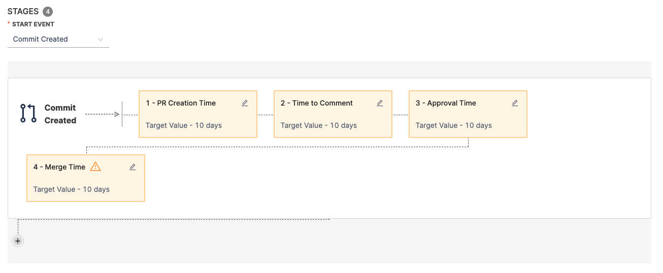 - Review the pre populated Stages that represent the PR lifecycle, from PR creation to merge. You can edit, add, and remove stages as needed. You can edit the data or fields that drive each stage, set time range goals, and more.