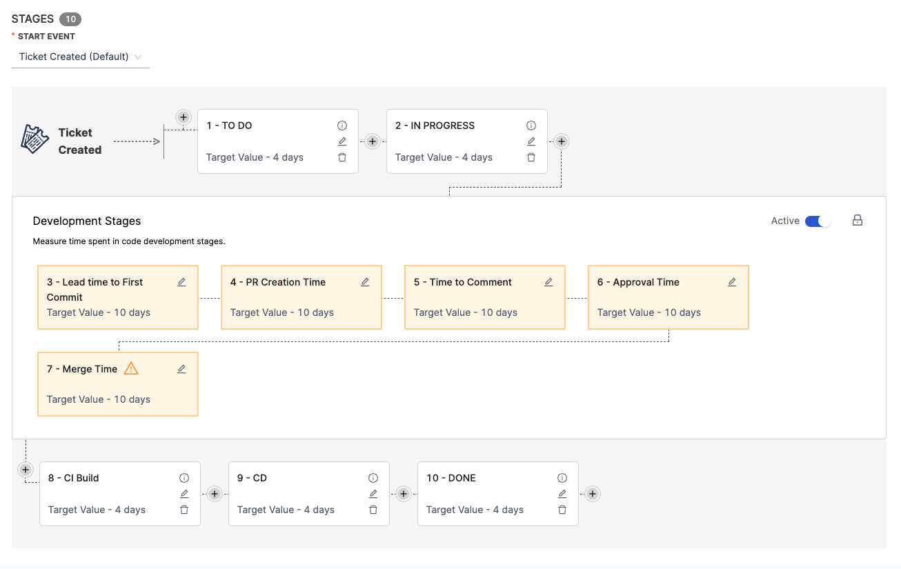 - Review the pre populated Development Stages and edit them, if necessary. These stages represent the progression of code in your SCM tool, from first commit to PR merge.