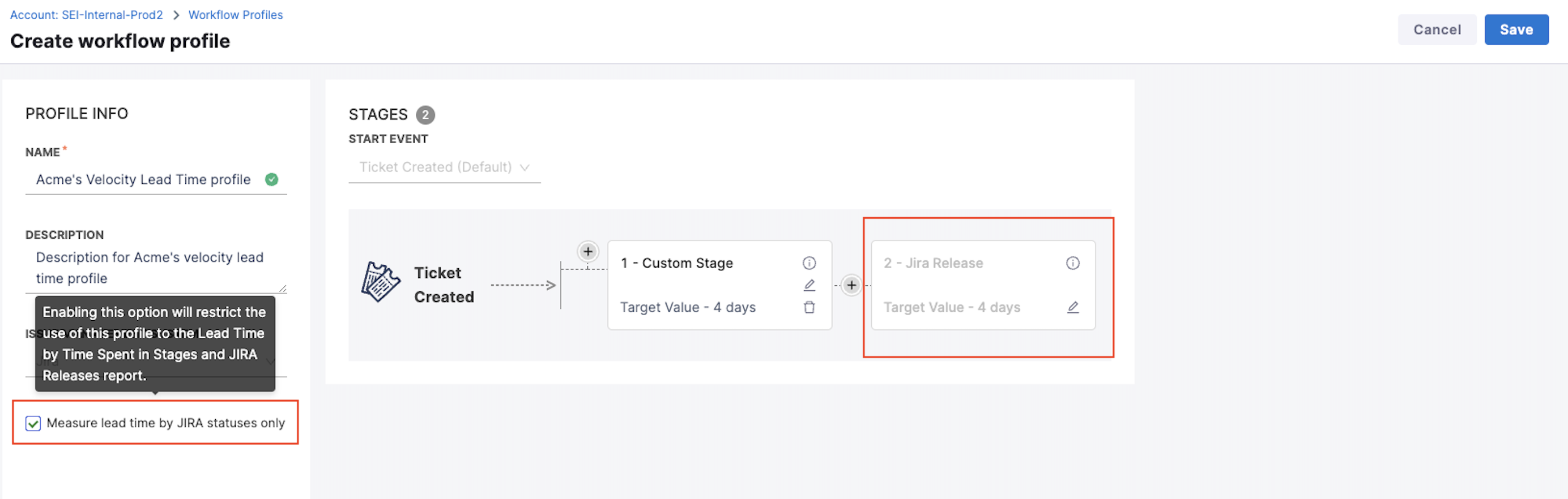 - For new profiles, the release stage is disabled by default. Enable it by selecting the checkbox to measure lead time using Jira statuses.