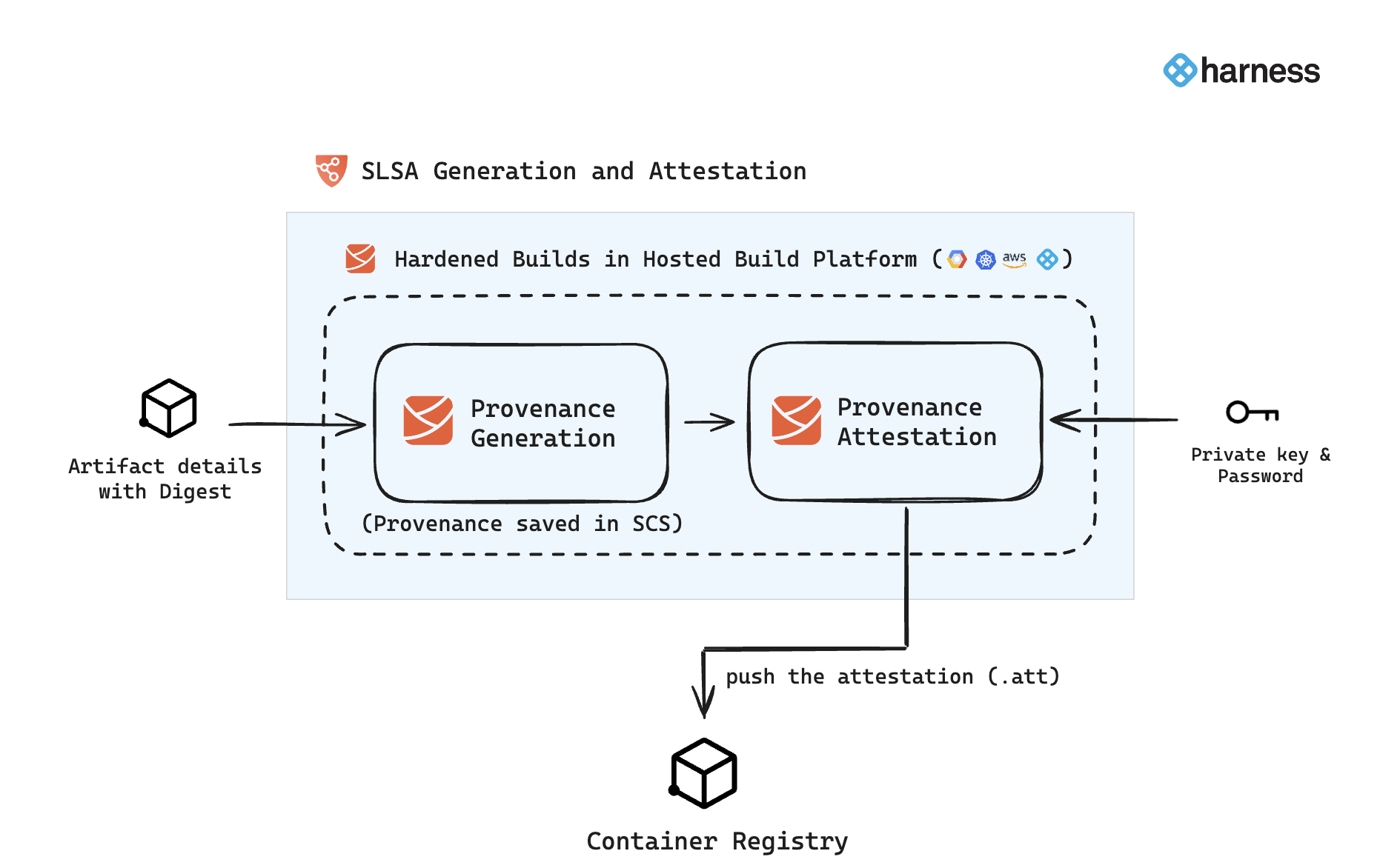 • Stores the SLSA Provenance in Harness and uploads the .att file to your container registry alongside the image.