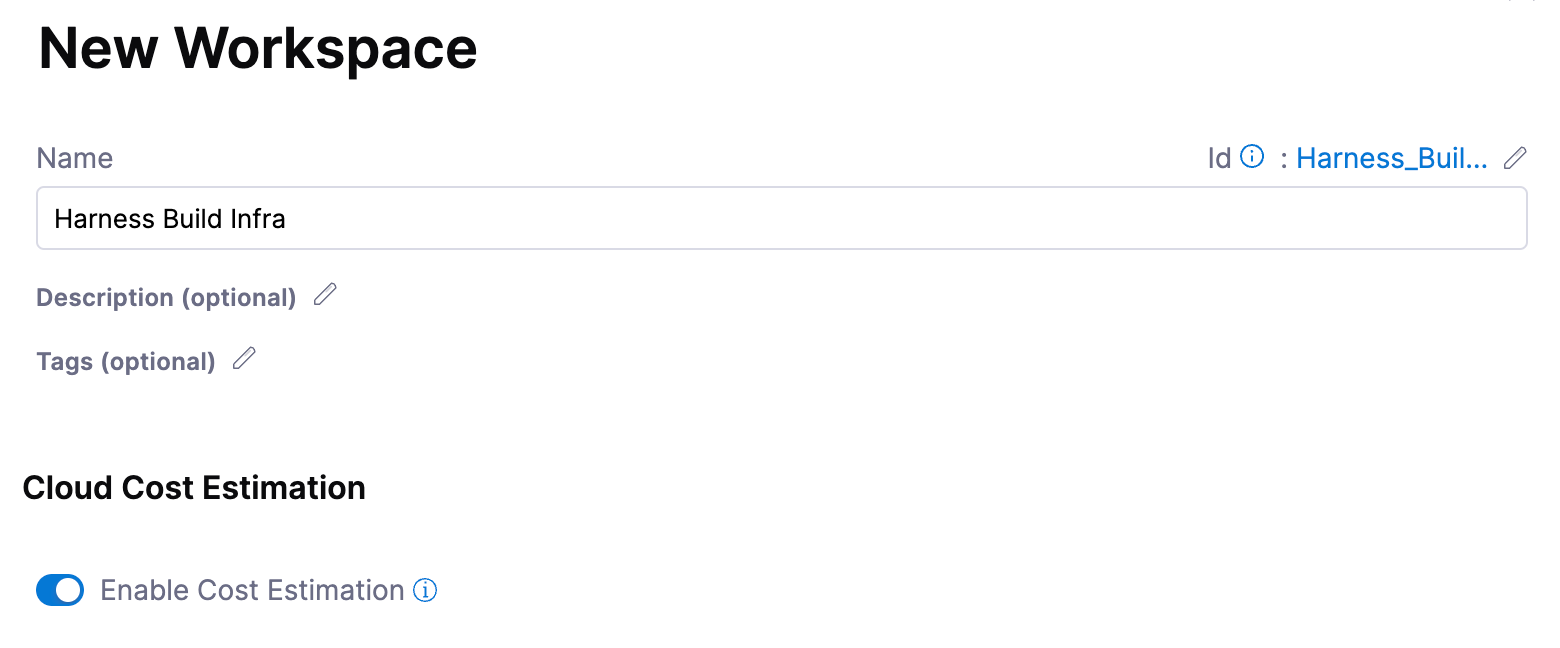 Navigate to the IaCM module and workspaces, then create a new workspace. Give it a name and be sure to enable cost estimation so we can be good stewards and know the impact we are having on the bill.